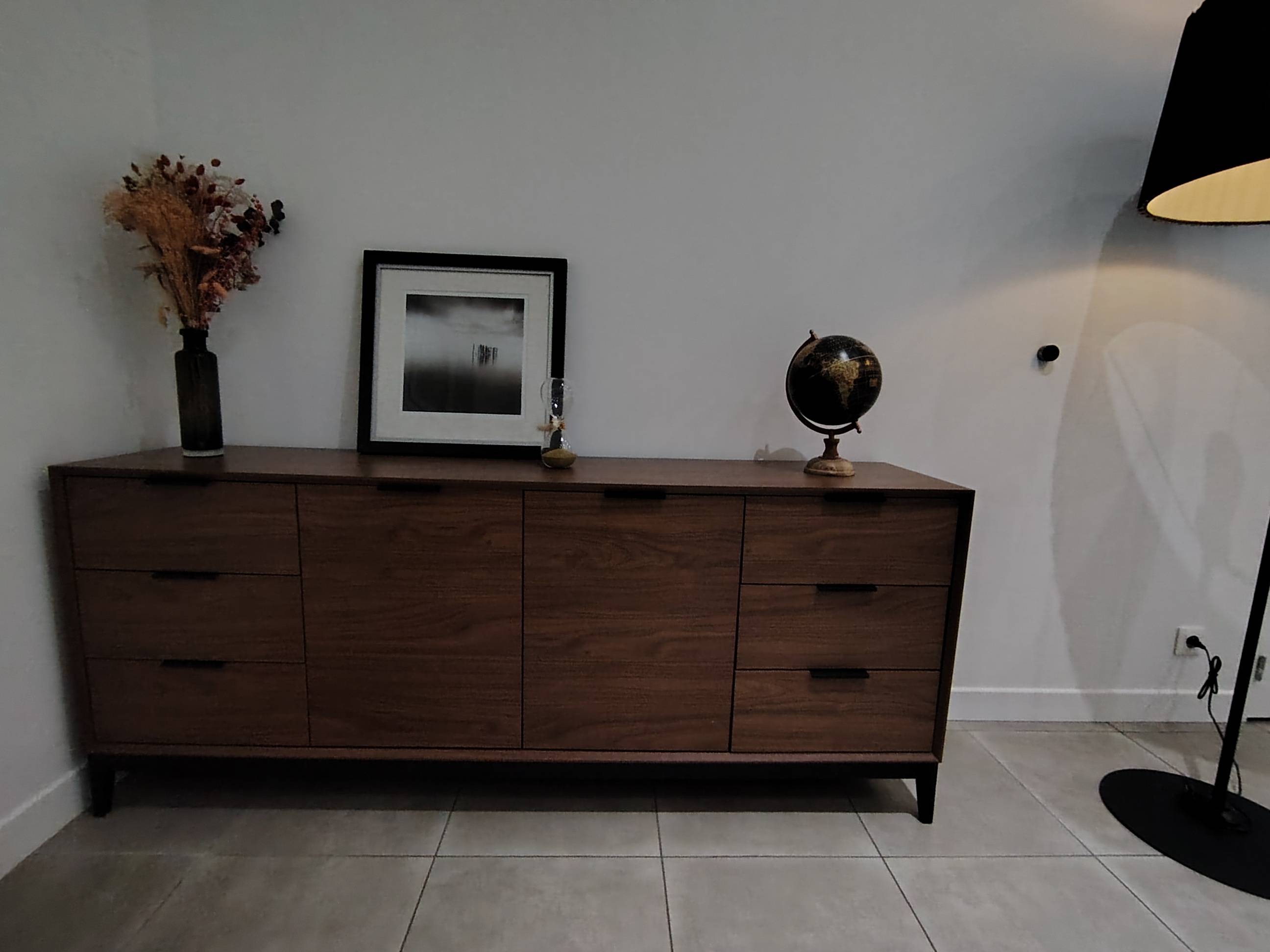 Si l'effet bois foncé lui donne une superbe connotation rétro, les lignes nettes et les accents métalliques noirs apportés par le piètement et les poignées modernisent l'ensemble. Un buffet vintage, parfaitement actuel !