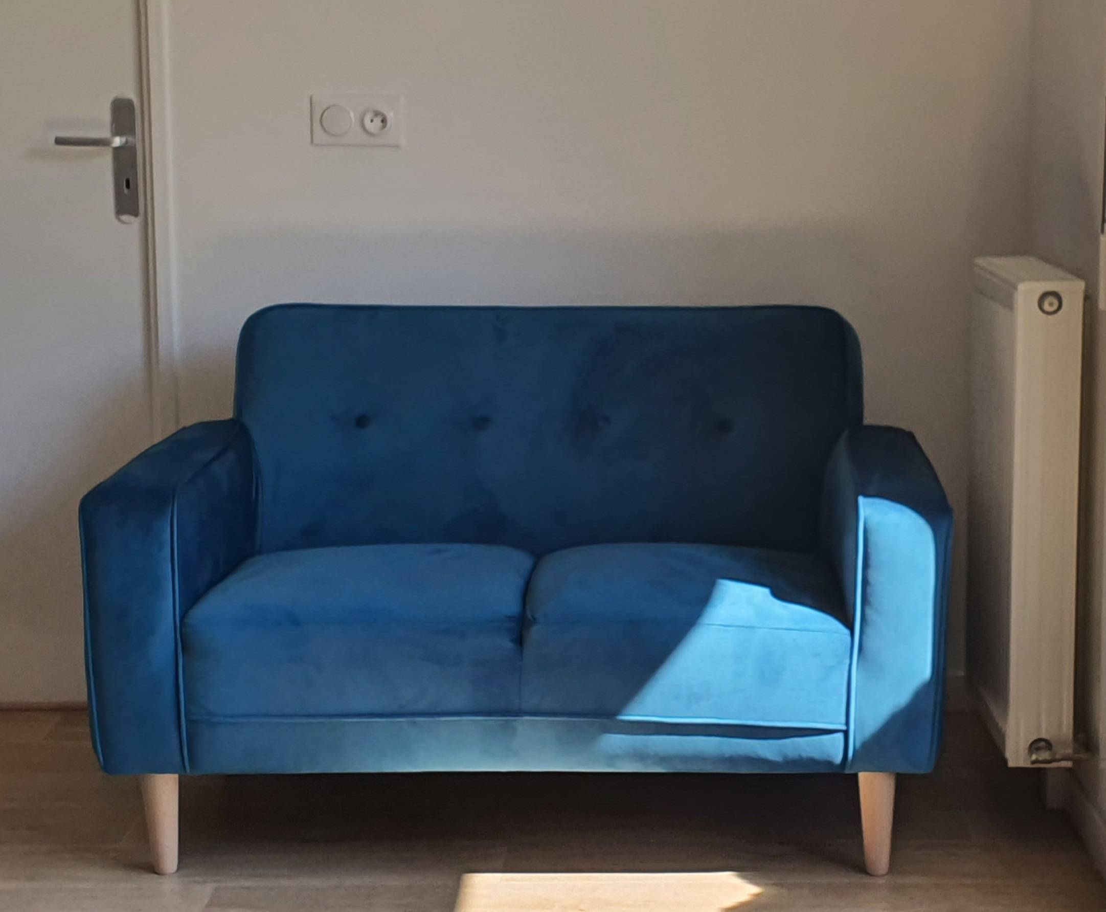 Avec sa ligne moderne et son revêtement tout doux, ce petit canapé ne manque pas de charme. Le magnifique velours bleu paon choisi pour revêtir l'ensemble est pile dans la tendance. Il est apprécié pour son toucher unique et son rendu élégant. On adore le mélange entre l'aspect luxueux du velours et le piètement naturel en hévéa massif. Chaleureux et authentique, il complète parfaitement cette assise en velours et ce dossier capitonné.