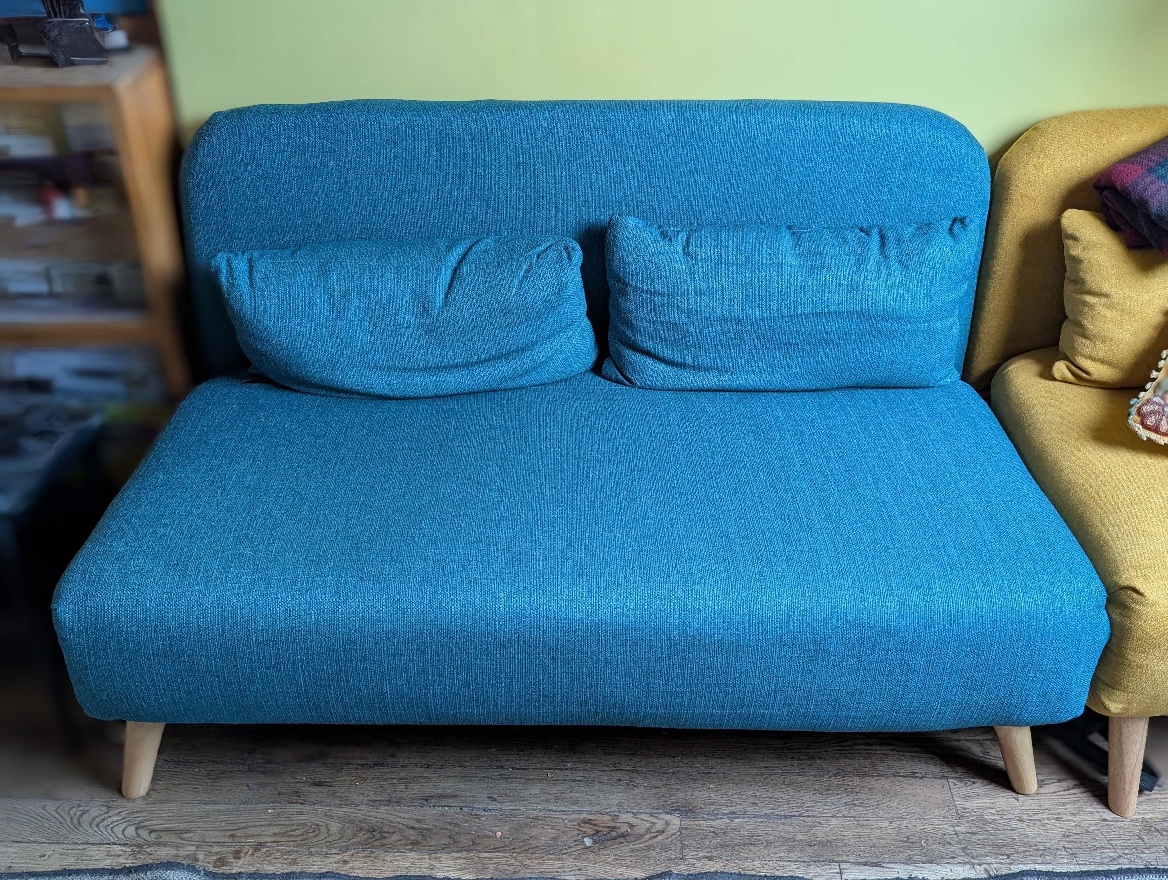 Avec cette chauffeuse convertible, on profite d'un joli petit canapé 2 places scandinave, le jour, et d'un couchage d'appoint pour deux, la nuit. Pour transformer cette chauffeuse en lit, il suffit simplement d'abaisser les deux extrémités et de sortir les pieds cachés dans l'assise et le dossier.