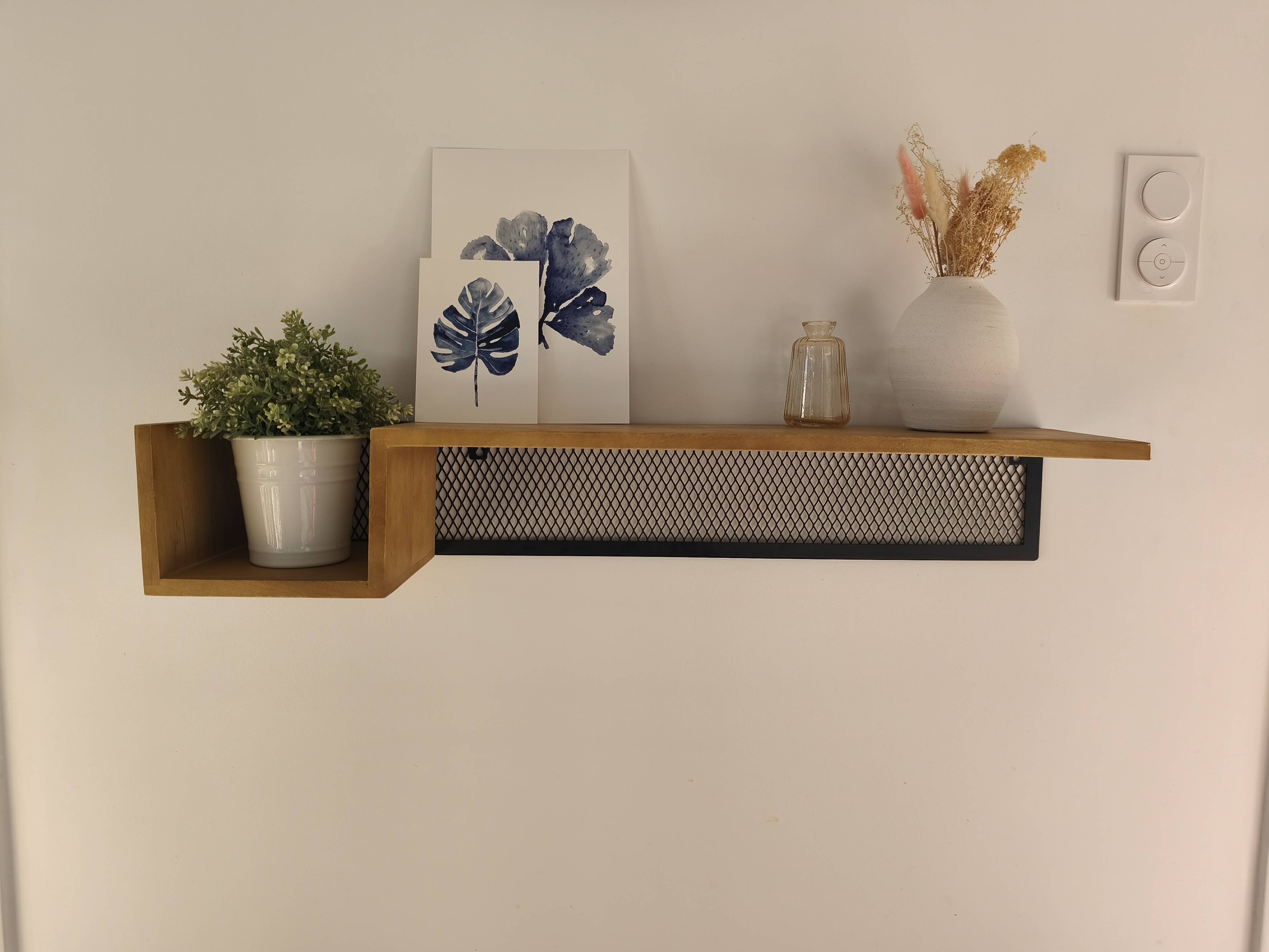 Cette petite tablette murale en bois aux dimensions L90 x P20 x H15 cm offre à elle seule deux espaces de rangements qui accueilleront vos petites plantes et quelques livres de poche agrémentés d'objets déco : une niche ouverte sur la partie basse et une étagère supérieure.