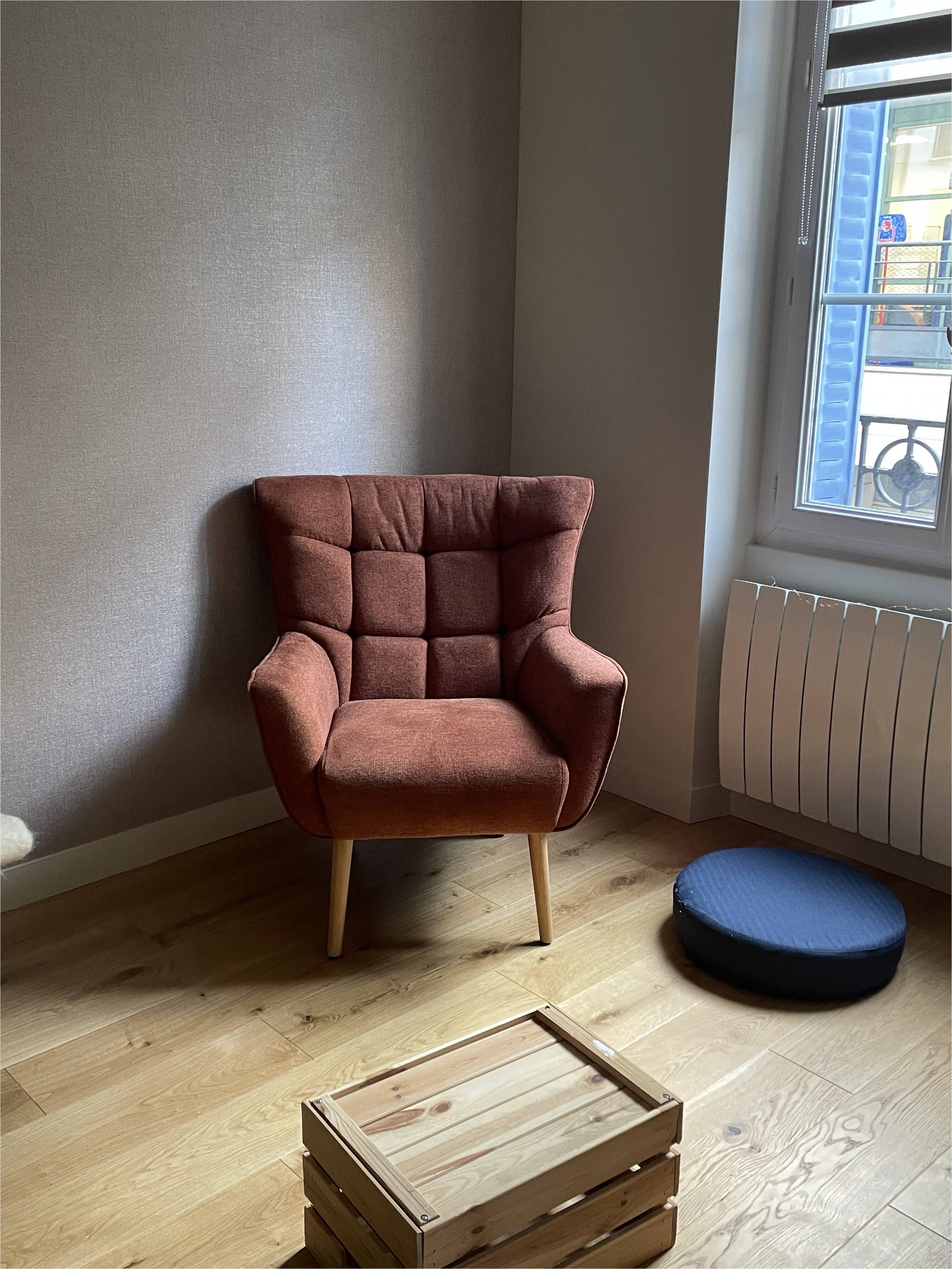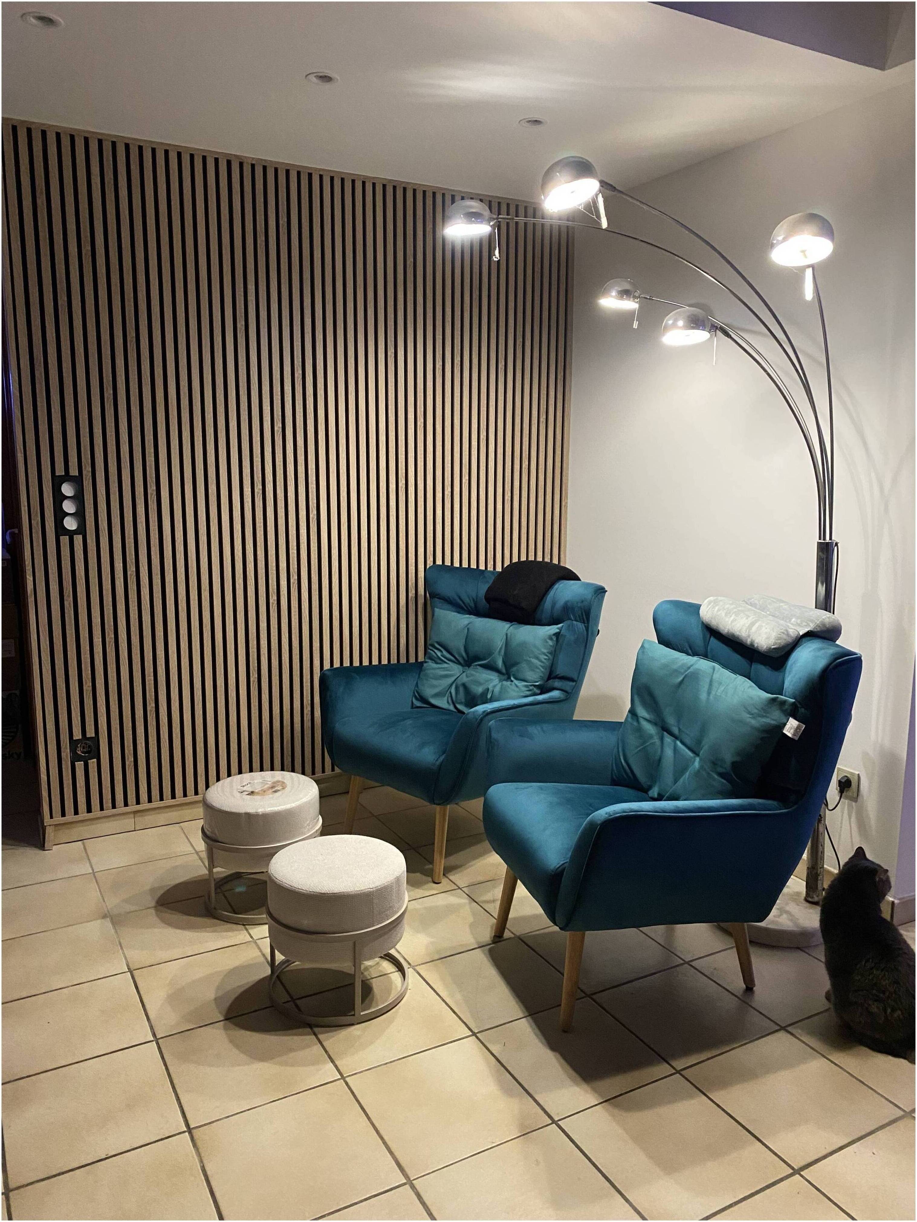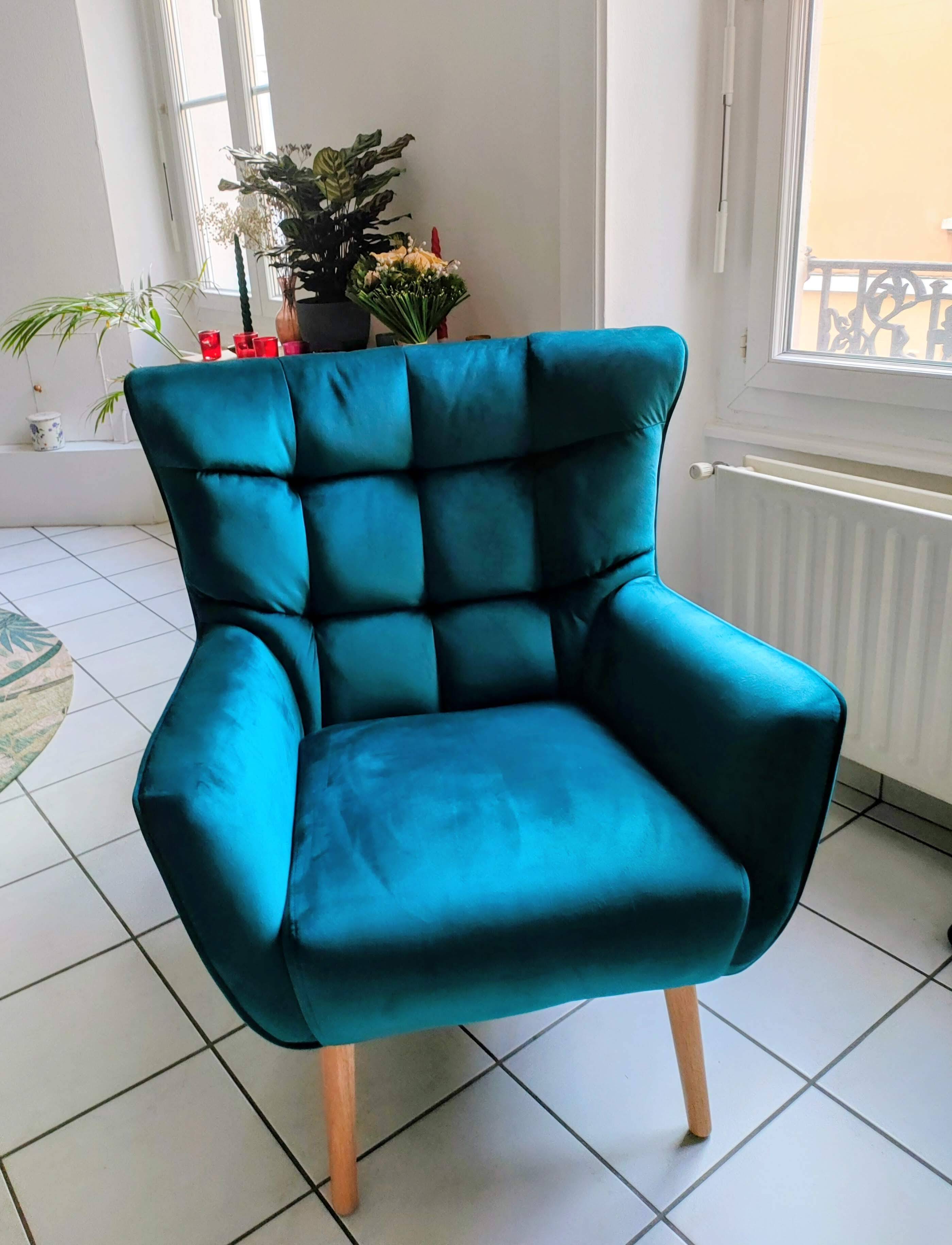 On dispose ce fauteuil bleu pétrole dans le séjour aux côtés d'un canapé scandinave pour s'aménager un intérieur cosy.