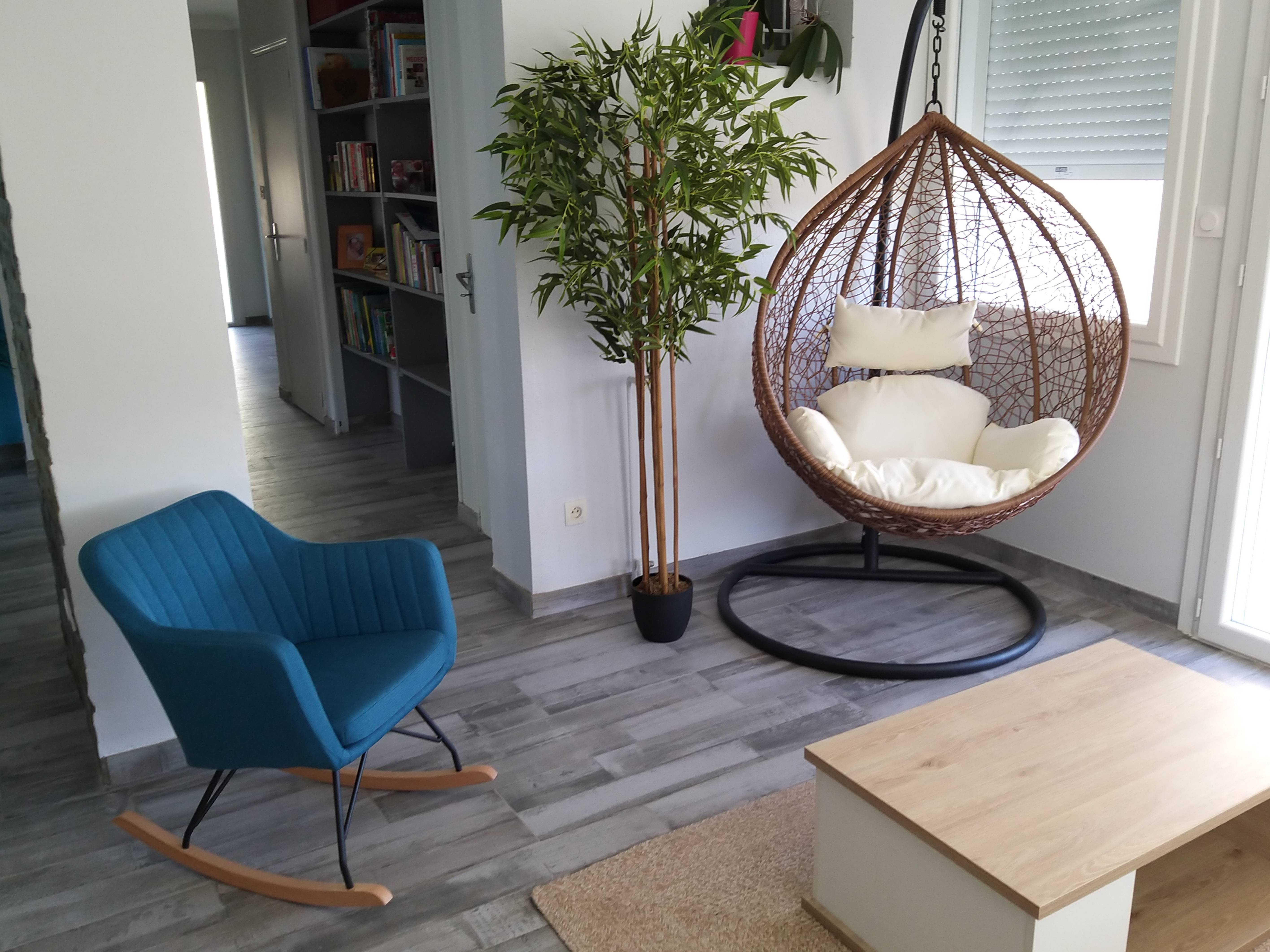 Fauteuil suspendu vendu avec son pied et ses coussins amovibles lavables à la main. Livré prêt à monter.