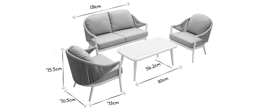 Ce salon de jardin cosy et raffiné comprend un canapé 2 places (assise : L120 x P43 x H44 cm), deux fauteuils (assise : L60 x P40 x H44 cm) et une table basse (L110 x P56,2 x H44 cm). Vous pouvez utiliser ces différents modules séparément ou bien les assembler selon vos besoins...