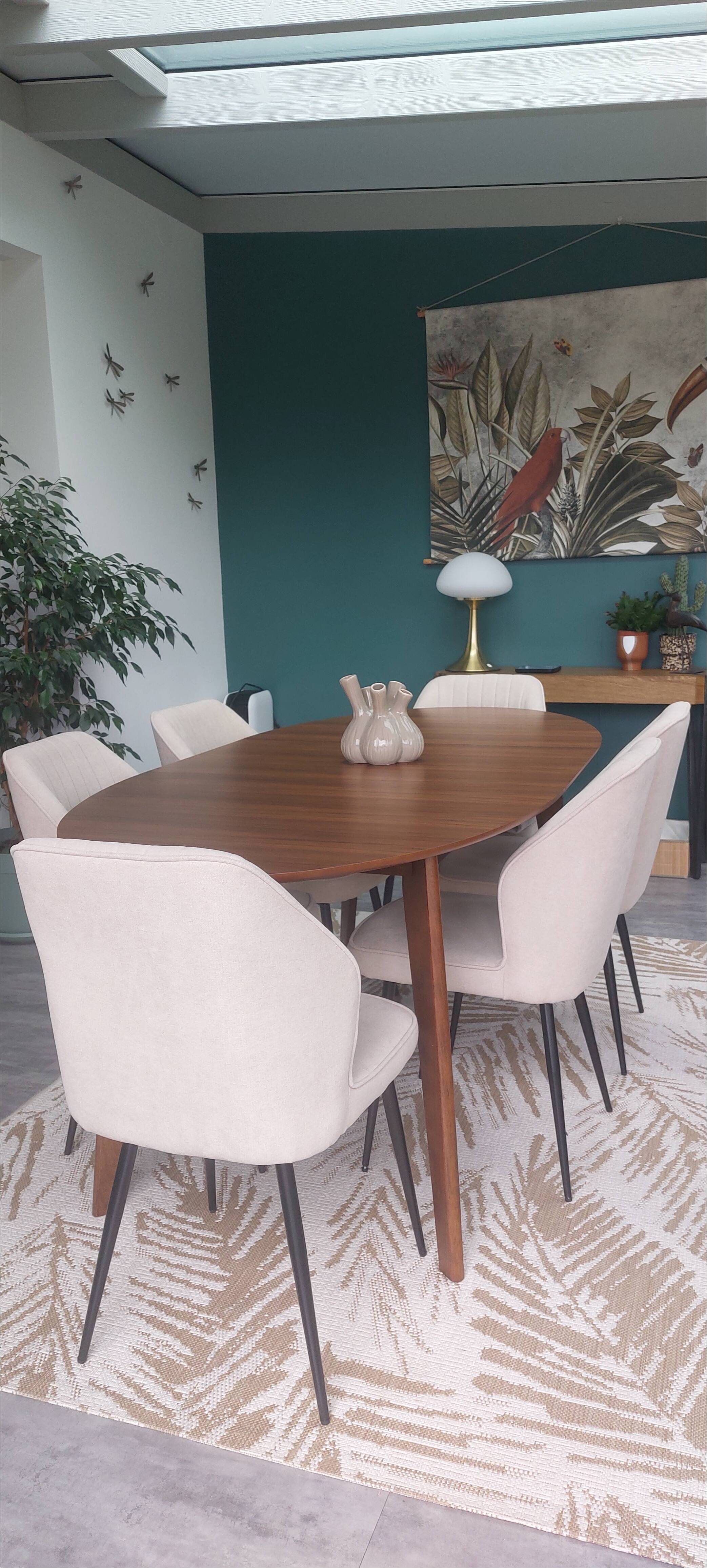 Pour mettre en valeur la beauté de cette table à rallonge ovale en bois foncé 4 à 6 personnes, on dispose autour de magnifiques fauteuils de table design !