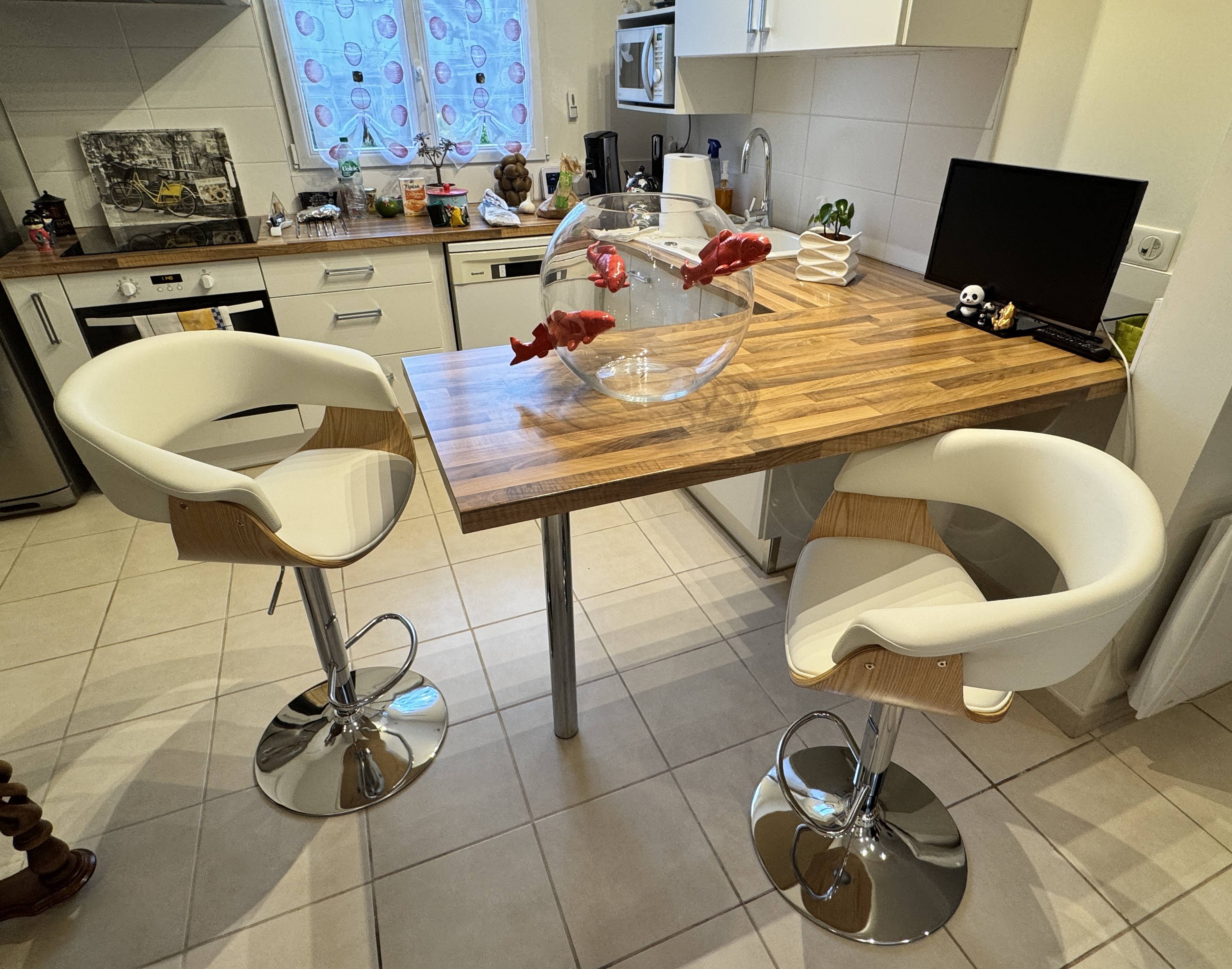 On s'aménage un espace repas sur mesure en disposant ces chaises hautes autour de l'îlot de cuisine modulable MAX.